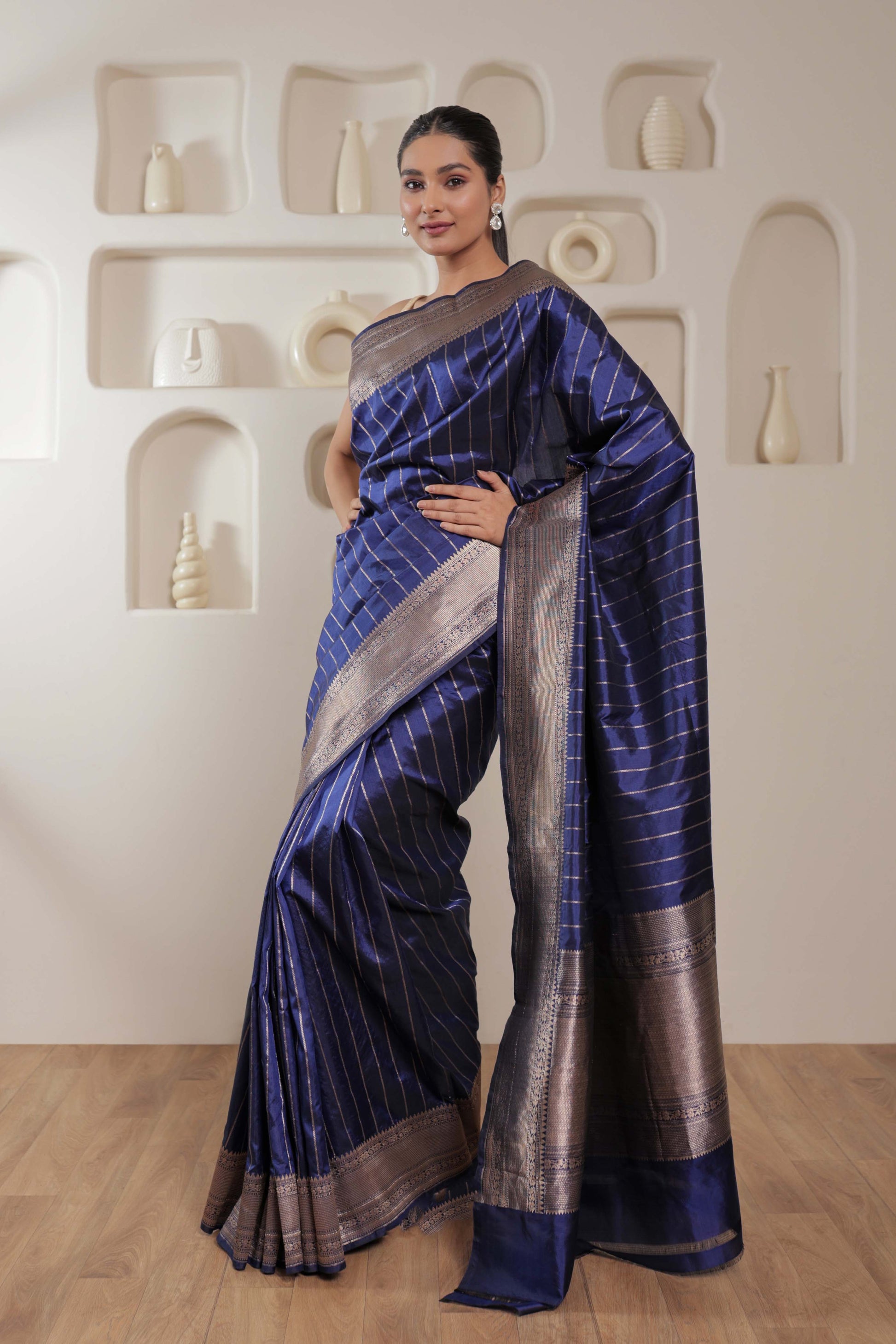 This beautiful Katan Silk Saree is patterned with a chic striped weave and an intricate Kadhua zari border. Showcasing striking stripes all over handwoven in pure Zari, the saree offers a contemporary take on the timeless Banarasi. The classic Midnight Blue shade is perfectly complemented with gilded zari pallu with geometric motifs.