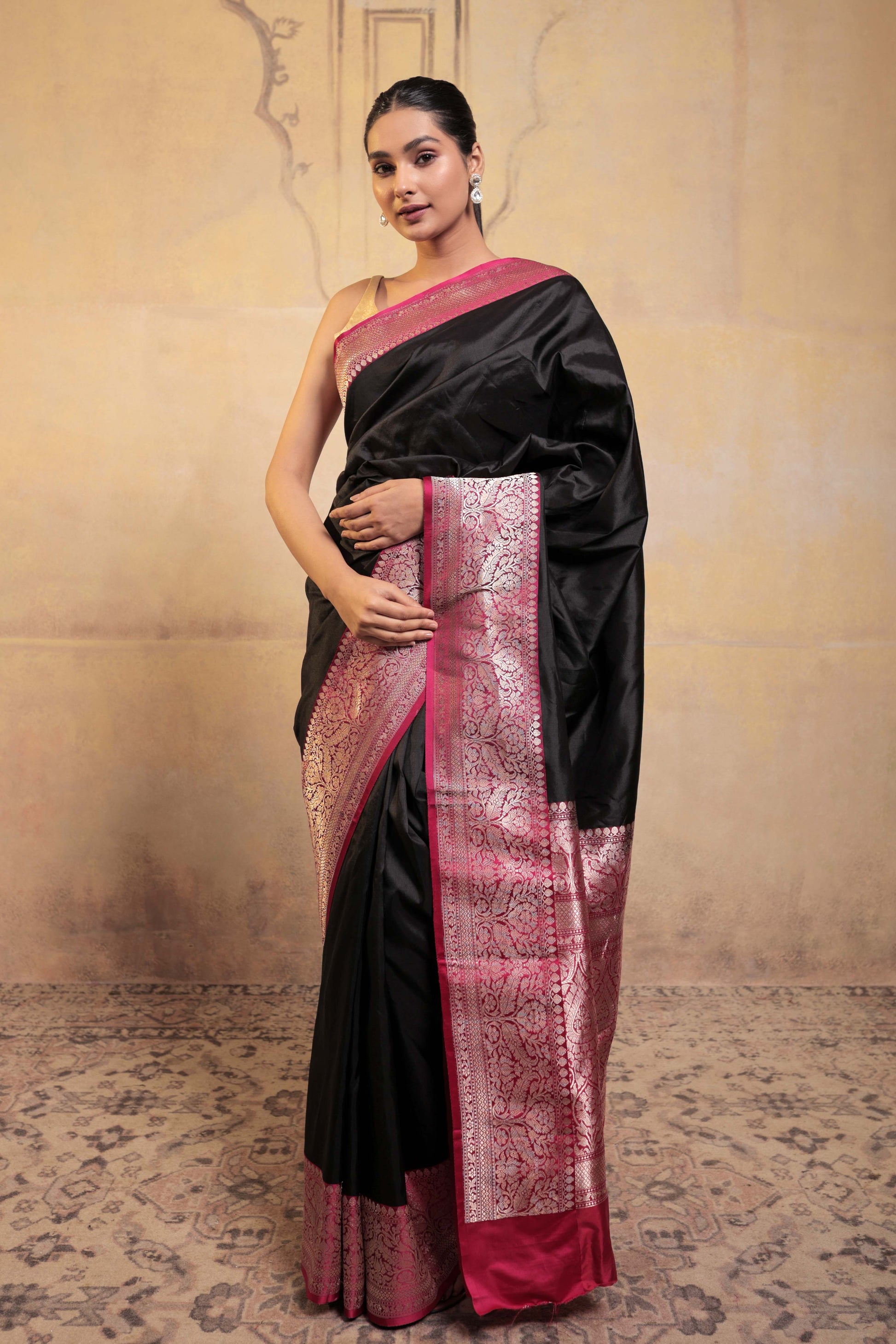 A classic Black plain-bodied Silk Saree with a bold Pink border with intricate silver Zari details and a magnificent Aanchal, this is a masterpiece of traditional Indian weaving art. The elegant pink border enhanced with compact floral motifs provides the saree a beautiful contrast that enhances the saree's visual appeal. Crafted from the finest Katan silk, this saree promises a drape that is both luxurious and captivating, ideal for celebrations and special occasions.