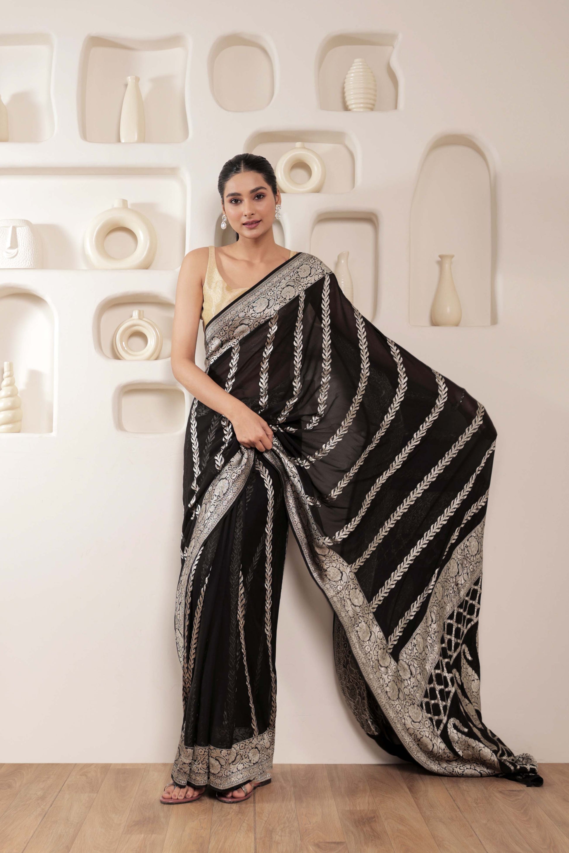A classic Black Georgette silk saree adorned with diagonally cascading vines in zari, set against an intricate pallu with an array of floral and foliate patterns. It is a Banarasi masterpiece which is true representation of craftsmanship of India. This free-flowing soft georgette saree gives a charming and alluring look on drape.